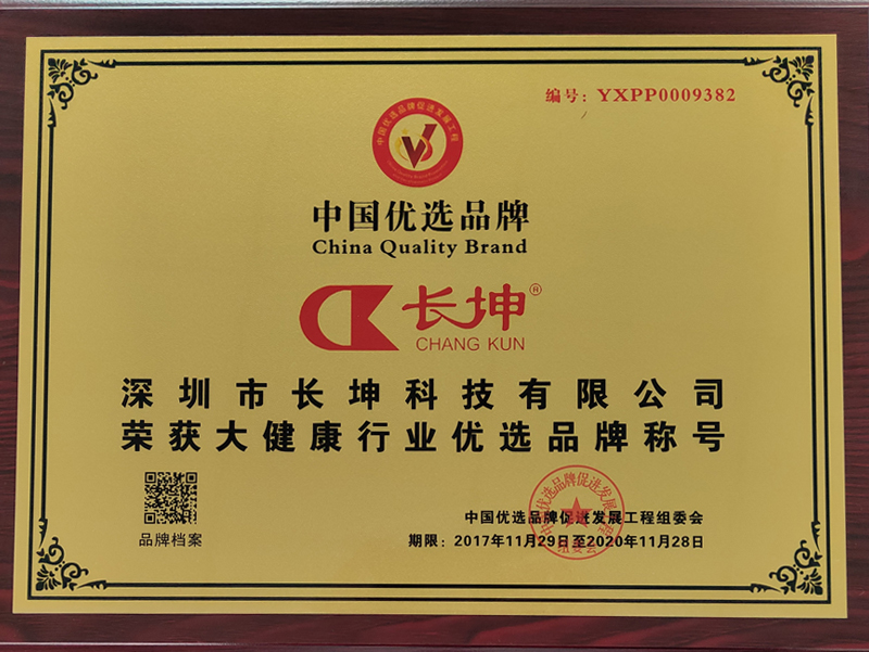 2017年12月,深圳市長(zhǎng)坤科技有限公司成功被中國(guó)優(yōu)選品牌促進(jìn)發(fā)展工程選中,評(píng)選為“中國(guó)優(yōu)選品牌”,并授予其“大健康”行業(yè)優(yōu)選品牌稱號(hào),以茲鼓勵(lì)。